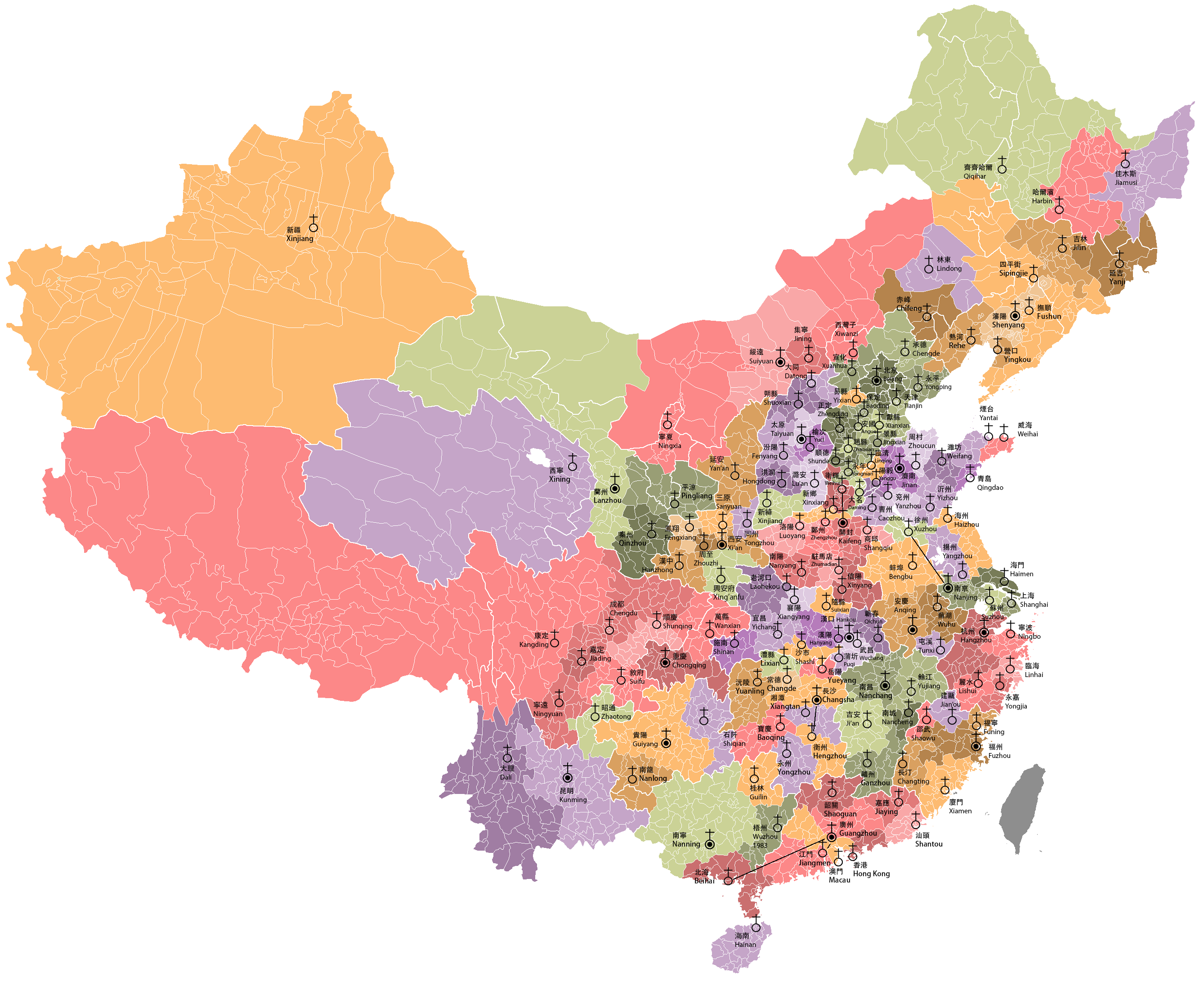 (图片摘自维基百科。其中承德教区为2018年后分置,1946年应属热河教区。按住Ctrl使用鼠标滚轮缩放)
